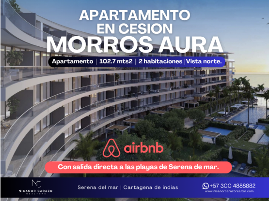 ESTADO DEL INMUEBLE: EXCELENTE - ¿LO QUIERES? VENTA DE APARTAMENTO DE DOS HABITACIONES CON VISTA LATERAL AL MAR CARIBE EN EL CONDOMINIO MORROS AURA EN SERENA DEL MAR CARTAGENA DE INDIAS | AREA TOTAL: 102.7 M2 | AREA INTERNA: 85 M2 | AREA TERRAZA: 17.7 M2 | PISO 4TO. | TIPO DE NEGOCIO: CESION DE DERECHOS FIDUCIARIOS.