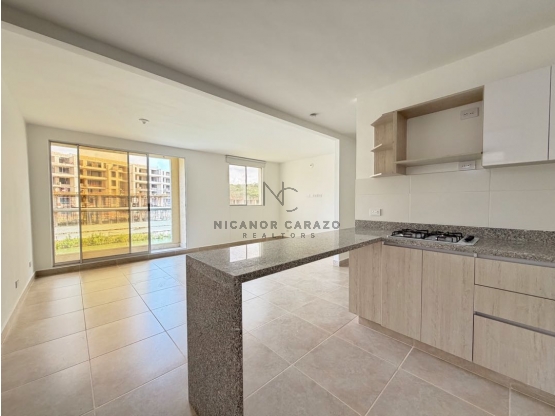 El apartamento cuenta con un area total de 72.5 mts2 los cuales se distribuyen de la siguiente manera: Espacio de sala - comedor, cocina abierta, una (1) Habitacion principal con vestier y baño interno, una (1) habitacion adicional con closet, ESTUDIO O TERCERA HABITACIÓN, baño social o compartido, balcon con vista exterior CON VISTA AL LAGO, zona de labores independiente y un parqueadero.