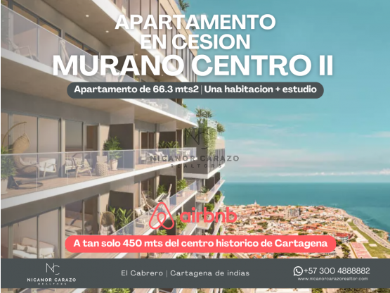NICANOR CARAZO REALTORS - ESTADO DEL INMUEBLE: EXCELENTE - ¿LO QUIERES? VENTA DE CESION DE APARTAMENTO DE UNA HABITACION + ESTUDIO (SEGUNDA HABITACION) EN EL EDIFICIO MURANO CENTRO II EN EL BARRIO EL CABRERO CARTAGENA DE INDIAS | Area total: 66.3 mts2 - Piso intermedio. | TIPO DE NEGOCIO: CESION DE DERECHOS FIDUCIARIOS | EL EDIFICIO PERMITE LA RENTA VACACIONAL