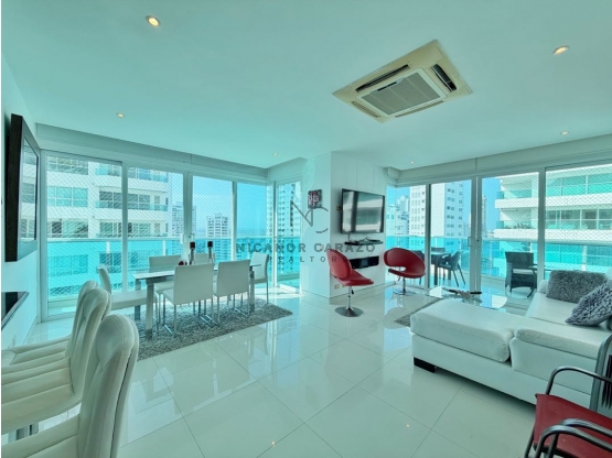 REPARTO: El apartamento cuenta con una area de 150 mts2 distribuido de la siguiente manera: Sala, comedor, cocina abierta completamente integral, amplio balcon con vista lateral a la bahia, baño social, zona de labores, cuarto y baño de servicio,  hall de alcobas 1 habitacion principal + baño con ducha + closet, 2 habitaciones adicionales con closet, baño compartido, un garaje.