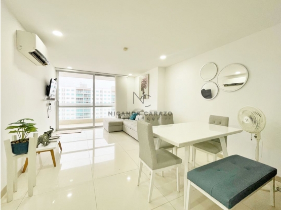 DISTRIBCIÓN:  Este apartamento cuenta con un area de 90 mts2 distribuidos de la siguiente manera: Sala - comedor, balcón con vista lateral al Mar Caribe, Cocina Integral abierta, zona de labores, 1 Alcoba principal + Closet + baño principal, baño social, Una (1) alcoba adicional con closet. Un parqueadero.