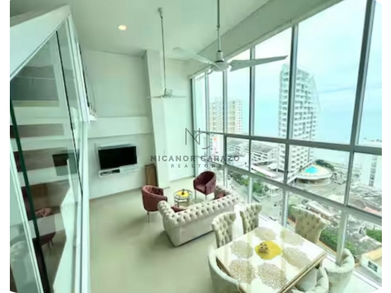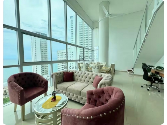 DISTRIBUCIÓN DEL INMUEBLE: Este espectacular dúplex de 140 mts2 cuenta con una sala-comedor de doble altura, ventanales de piso a techo y una increíble vista al mar. La cocina tipo americano con isla está conectada a la zona de labores. En el primer nivel se encuentra una alcoba con closet, y baño. Subiendo las escaleras a lnivel superior, encontrarás una amplia alcoba con closet y baño privado, y balcon con vista al mar y a la ciudad y una segunda habitacion con su baño privado, El apartamento se vende completamente amoblado, ofreciendo lujo y comodidad.